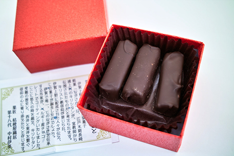 バレンタインデーシーズンに日本橋高島屋S.C.の銘菓百選でながさきショコラを買いました。パッケージはかぶせ式の赤い貼り箱です。うるし紙のような触り心地が上品で、いつまでも取っておきたくなる菓子箱です。
