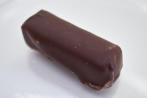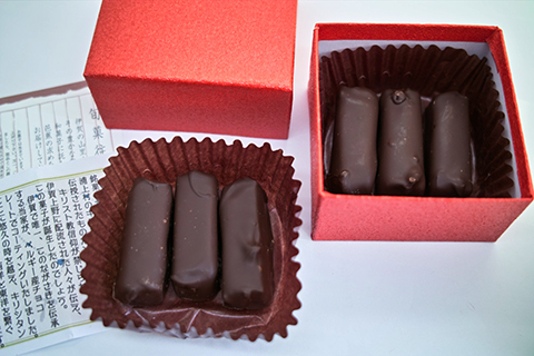 桔梗屋織居の「ながさき」は煮上げた糖蜜に小麦粉を合わせた半生菓子とのことで、材料が異なりますが落雁や和三盆に似たポクポクした食感があります。香り控えめでロースト深めの昔ながらのチョコレートを使った、広い世代に受け入れられる味です。黒糖の旨味をチョコレートのロースト感が支えて味に深みがありますが、甘味は和菓子の範疇で控えめ。もちろん日本茶によく合います。