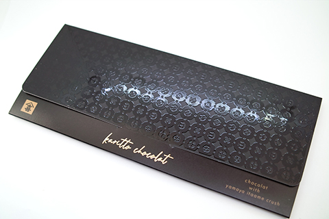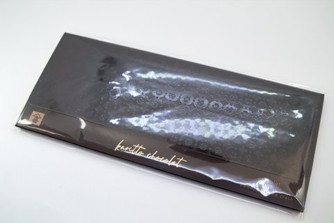 美しくエンボス加工された黒い封筒型のパッケージ。金字で商品名が入っています。モノグラムの長財布のようにも見えて高級感があります。型押しされている模様は、板あめ折詰の箱と同じもの。同じ模様でも素材が違うとこうも印象が変わるものなんですね。