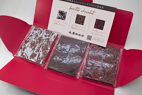 パッケージの裏面は赤。黒と赤のコントラストがこれまたおシャレ。中に3種類の板チョコレートが入っています。