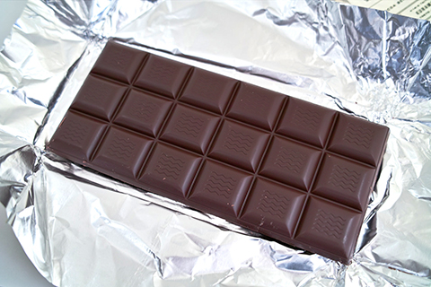 しっかりとした厚手の銀紙で包まれています。銀紙を開くと、中からタブレットが現れました。気泡一つないとてもきれいな成形です。商品説明によると「フレーバーノート:クリームチーズ、グレープフルーツ、ジン。野鳥保護区レゼルバ・ソルサルを囲むカカオ農園から集めたカカオ豆で、生のカカオ豆からも多種多様なフレーバーを感じられます。甘さだけでなく、酸味や苦味のバランスを工夫してすっきりとした味わいに仕上げました。おすすめのペアリングは柑橘系のフルーティーなジンやビール、緑茶や浅煎りのコーヒーなど」とのこと。