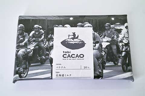 &LOCALS ニュウマン高輪店で、タビカカオ 北海道ミルクを買いました。パッケージはベトナム市内を走る大量のバイクの写真がプリントされている包み紙。ロゴと商品名が入ったシールで留められています。