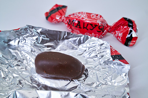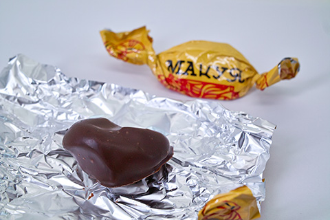 プラムゼリーは青色の包み紙。商品説明によると「乾燥プラムを歯ごたえのあるロシア風ゼリーに仕上げました。ゼリーとチョコのシナジー」とのこと。