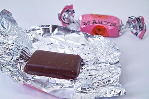 チョコクリームは桃色の包み紙。商品説明によると「ビターチョコ(カカオマス)を加え、ピリッとした味に仕上げた、ベーシックなロシアチョコです」とのこと。