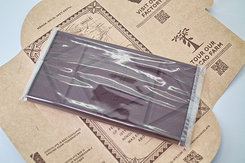 オアフ島コオラウポコバー 70%(O’AHU ISLAND KO’OLAUPOKO 70% DARK CHOCOLATE)は紫色の帯が目印のパッケージです。封筒型のパッケージには銅版画風のイラストがあり、ハワイの伝統的なピリ草でできた家屋ハレが描かれています。