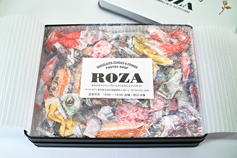 贈答用のミックスチョコレートを買いました。オリジナルの包装紙に丁寧に包まれ、金の細いリボンで飾られています。パッケージは角型の菓子缶。容器部分は黒、蓋はパールホワイトに色分けされたものでシックです。蓋にバラとブランドロゴがプリントされています。