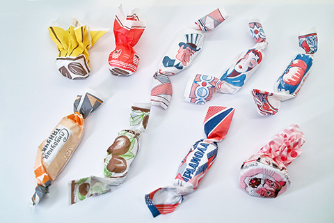中にはキャンディ包みのチョコレートがたっぷり入っています。広げてみると、9種類のチョコレートが入っていました。上段左から右に、アーモンドボンボン、コーヒー、ヌガー、タフィー、レーズンイリス、フルーツ(アプリコット)、プラム、ラジオカー、ラムボンボンです。