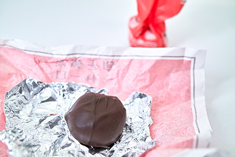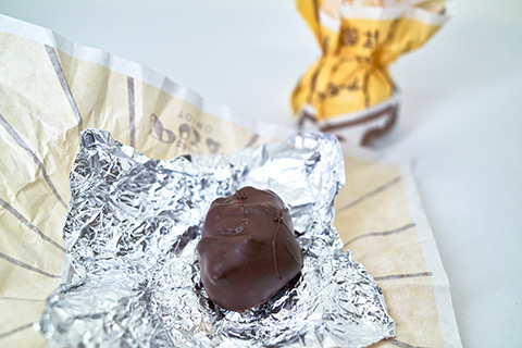 センターにはコーヒーの香りがするポマードカが入っています。コーティングにはスイートチョコレートが使われています。甘いので、小さな一粒でも満足感があります。コーヒーの温かみある香りがおいしい。