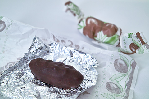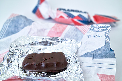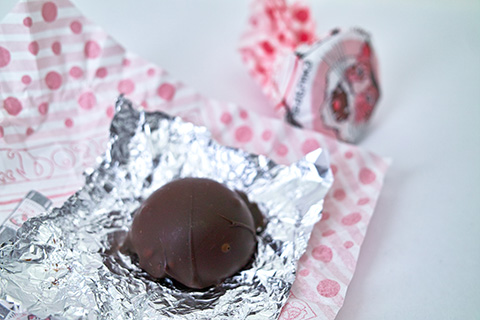 センターはプラムの果肉入りのポマードカ(ミルククリーム)で、コーティングはスイートチョコレートです。レトロで上品な包み紙そのままに、甘くてロマンチックな味わいです。