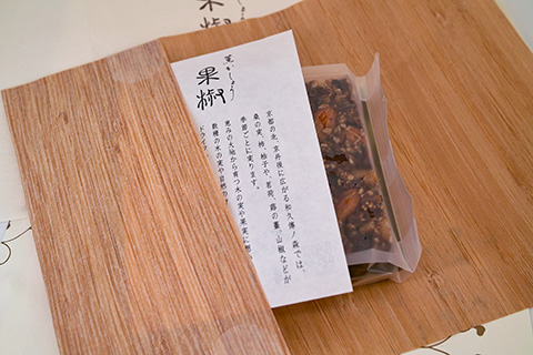 商品説明によると「京都の北、京丹後に広がる和久傳ノ森では、 桑の実、柿、柚子や、茗荷、蕗の薹、山椒などが季節ごとに実ります。恵みの大地から育つ木の実や果実に想いを馳せ、 数種の木の実や自然の甘みが優しいドライフルーツに、山椒をしのばせ、歯ざわりよく寄せ固めた実りのお菓子を仕立てました。特別に合わせたカカオニブの苦みとともに、 大地から生まれる多彩な風味をお楽しみ下さい」とのこと。