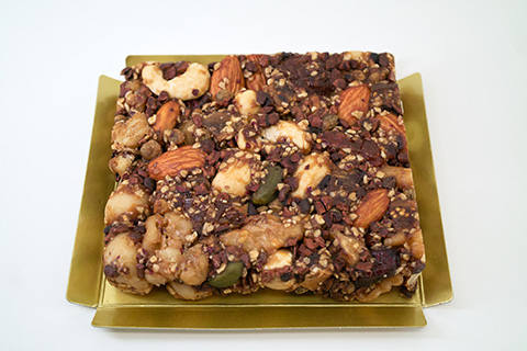 原材料:アーモンド(アメリカ)、カシューナッツ(インド)、くるみ(アメリカ)、マカダミアナッツ(オーストラリア)、黒糖(国名内製造)、カカオニブ、ドライイチジク、ドライチェリートマト、小豆、ドライクランベリー、水飴、蜂蜜、柚子ペースト、ピスタチオ、実山椒、和三盆糖/酸味料、(一部にくるみ・アーモンド・ カシューナッツ・マカダミアナッツを含む)