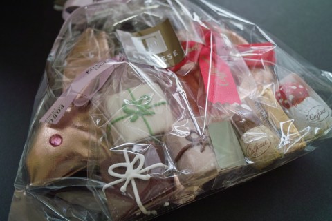 お友達からF.O.B COOP ENTHESEのリボンで飾られたお誕生日プレゼントを貰いました。金色のうさぎさんのポーチとカファレルのチョコレートとクッキーが入っています。