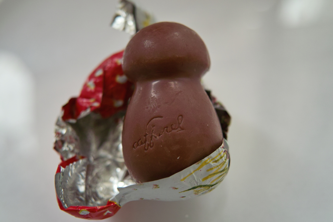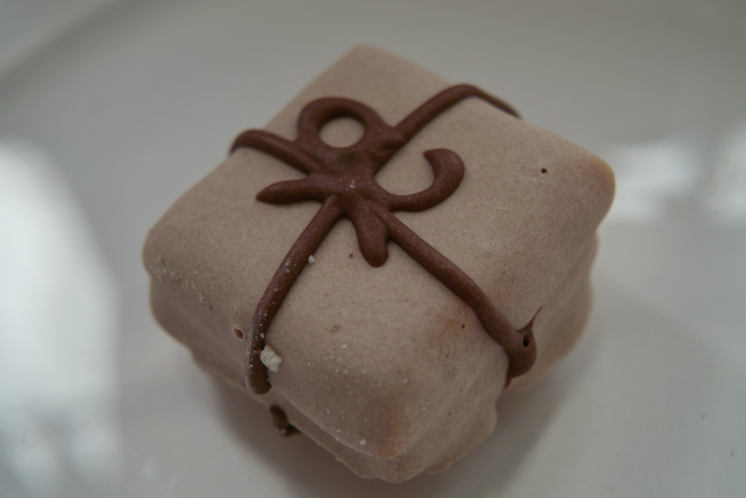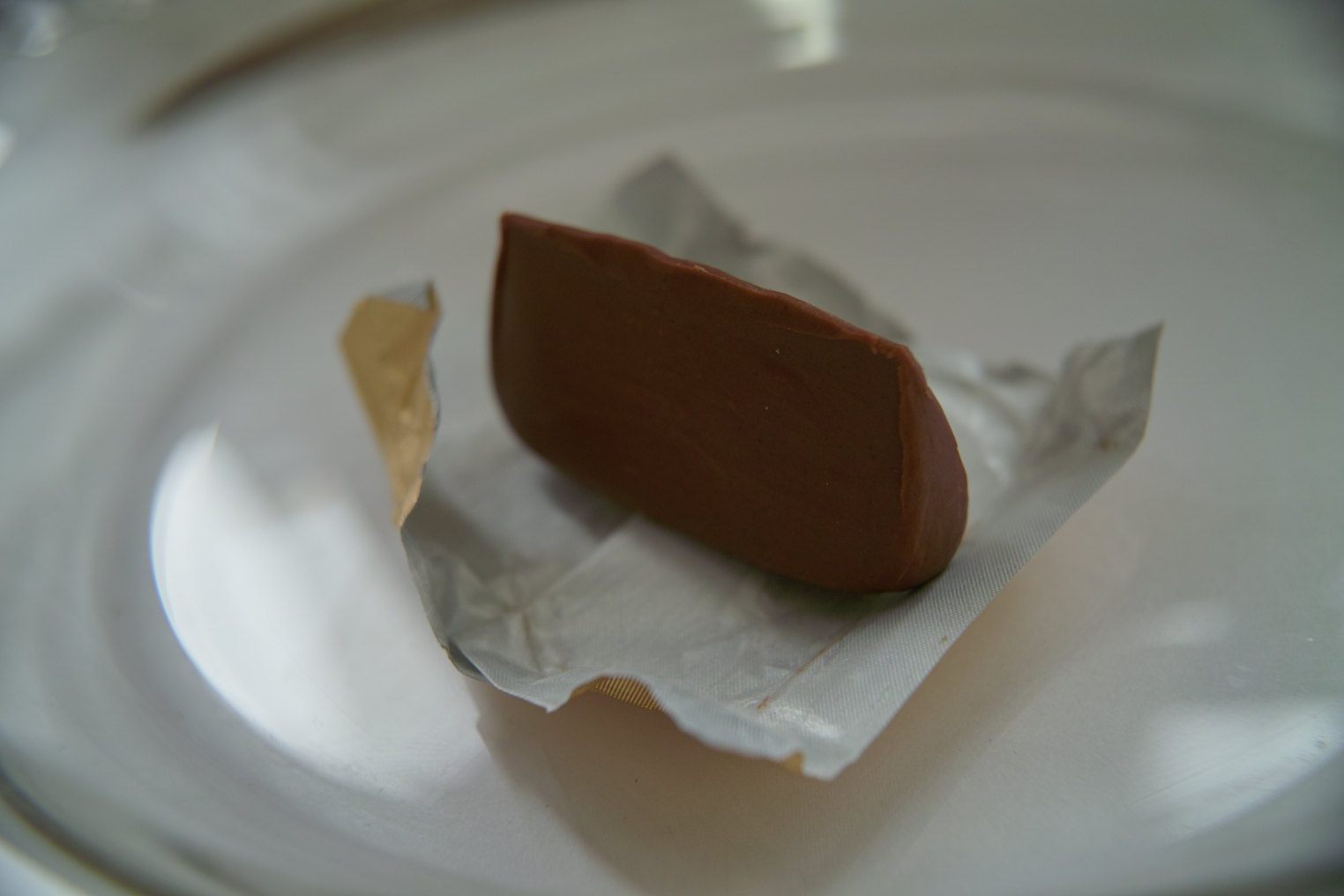 ヘーゼルナッツを30%含んだミルク味のジャンドゥーヤ。見た目はミルクチョコレートにしてはやや濃い茶色です。ナッツを焦がしたような苦味は、チョコレートの苦味よりもややしつこい。口溶けは滑らかですが、喉にからみつく粘りがあります。1865年以来作られている伝統の味は、ナッツの苦味が新鮮でした。