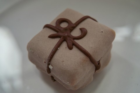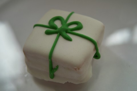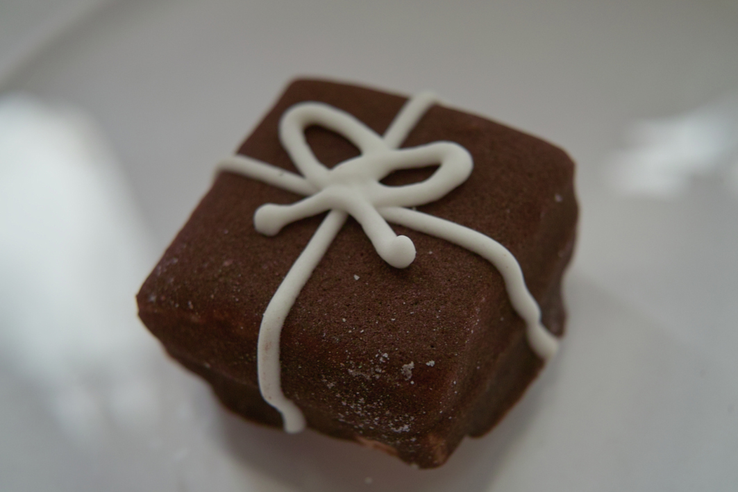 こちらはプレゼントパッケージの形のクッキーです。チョコレートじゃありませんが、3色のアイシングされたクッキーがかわいいので、一緒に紹介します。