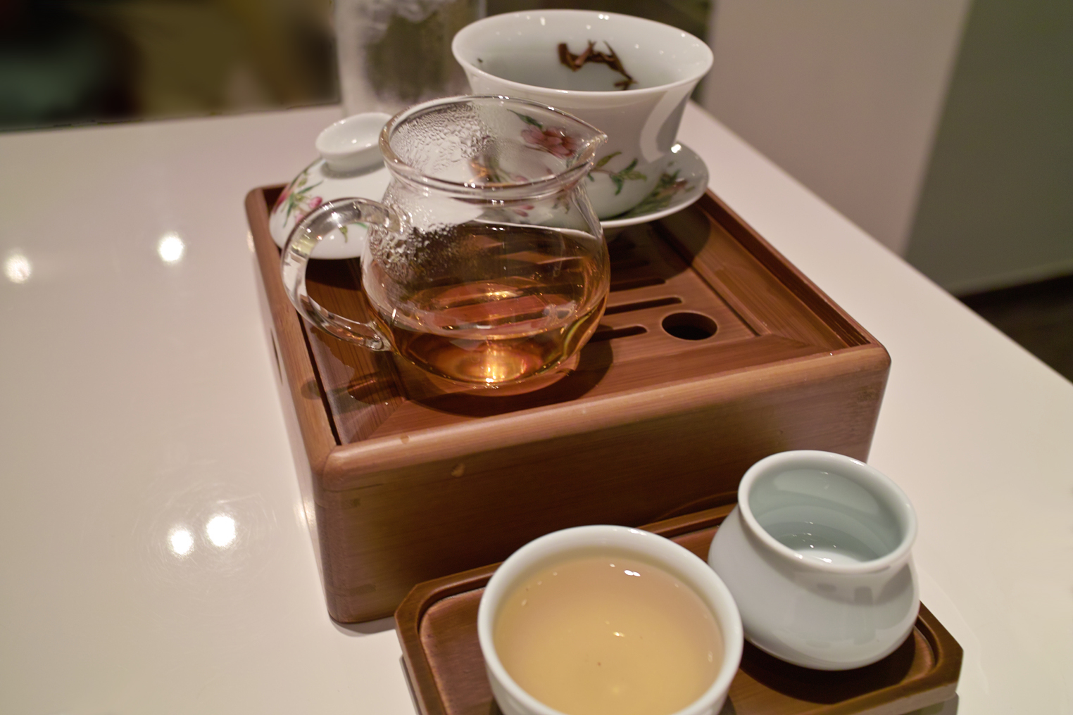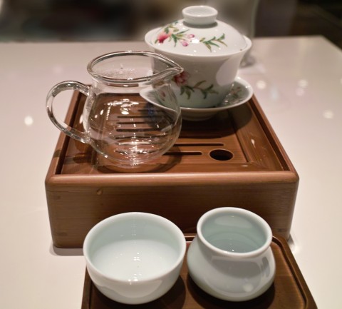 蓋つきのお茶碗に茶葉があり、そちらにやや温度を下げたお湯が注がれます。しばし茶葉が開くのを待って、ガラスの容器に移されます。手前の小さなお盆にセットされたのが、香用(飲み口が小さい方)と飲用の器です。こういう細やかな器具でお茶を楽しむところは、日本の茶道と同じですね。