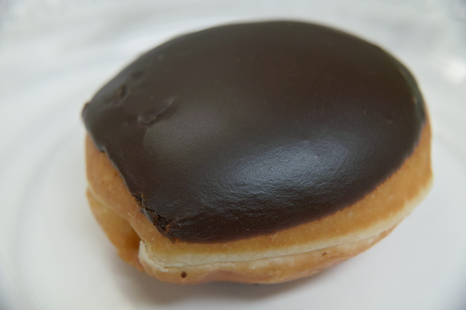 チョコレートカスタードは「リッチなババロア風カスタードを詰めたイーストドーナツに、なめらかなチョコレートアイシングをつけました」というもの。柔らかな食感のイーストドーナツを割ると、中にはカスタードクリームが入っています。ちょっとクリームが少ないと思うけれど、これは上にかかったチョコレートの苦甘さ楽しむための配分でしょう。カスタードが多すぎたら、このおいしいチョコレートが単なる添え物になったしまうものね。カスタードもおいしいし、チョコレートもおいしい、贅沢なドーナツです。