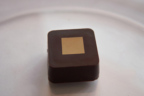 ミルクチョコレートの方には華やかながらか清涼感のある香料を使っています。中にはキャラメルソースがとろり。ミルクキャラメルのコーティングは薄いので、口に入れるとすぐにキャラメルソースが出てきます。どろりとしたチョコレートより先にキャラメルが喉をとおって甘さがしみます。キャラメルの甘さと程よくチョコレートが混ざり合って、甘さとミルクのまろやかさとそれに加わるカカオの豊かな風味、苦みがこのボンボンを上品にまとめています。
