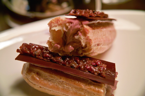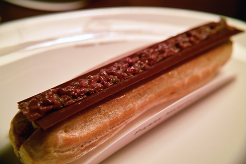 つまり、エクレアとプレートを合わせると、さっぱり目の柔らかいクリームを包む塩味パリパリのシュー、ヌガティーヌからは焦がした砂糖からくる苦さと甘味、ナッツの芳しさ、そしてチョコレートプレートからカカオの風味が加わります。一口で幾重にも重なったフレーバーが洗練されて味わえるというわけです。おいしくないわけがありません。