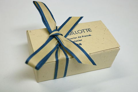青い縁取りの箱と同色のベージュのリボンがついた詰め合わせは、4×7センチのとても小さなパッケージ。ショコラバーとセミナーで味を堪能しているから買おうと思うけど、普通はこの見た目で2310円は出せない。
