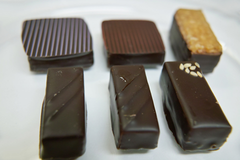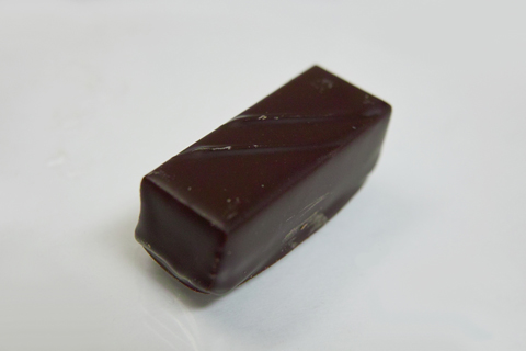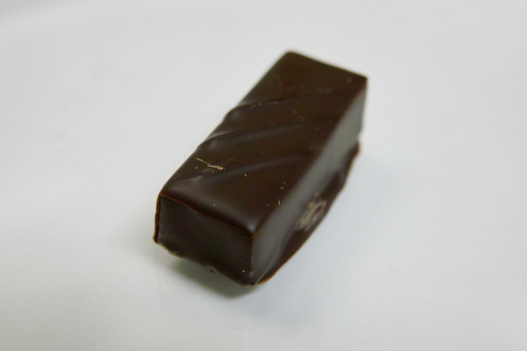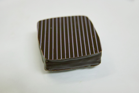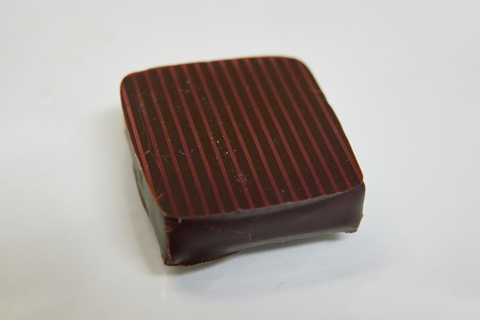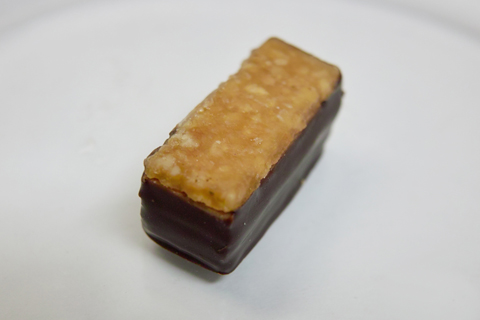 これまた凝った一品。黄色くみえる層はナッツの粗引きが入ったバターヌガティーヌ、その下にフランボワーズのジュレ、さらにヘーゼルナッツのジャンドゥーヤという組み合わせをビターチョコレートで包んでいます。舌の上で溶かすとジュレもヌガティーヌも溶けずに残るので、こちらは適度にかみながらいただきましょう。キャラメルのまろやかさとジュレの酸味が印象的な味です。
