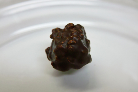 粒チョコレートの最後は、ちょっと歪な楕円のビターチョコレート。これもセンターはナッツでしょう。