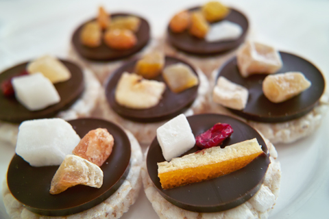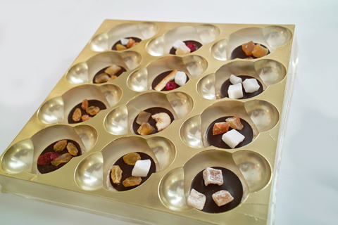 中はお猿さんの顔みたいな枠に支えられて、整然とチョコレートが並んでいます。いろいろなドライフルーツが乗っていて、どれをつまもうか、悩みます。おいしそう。