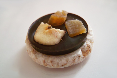 お米の部分はポン煎餅(ポン菓子の煎餅)で、その上に甘みと苦味がシャープなビターチョコレートが乗っています。ドライフルーツの甘みと酸味が合わさって、組み合わせとしてはなかなか楽しい。問題はポン菓子の食感なのですが、このチョコレートは密封されていない上に乾燥剤が入っていないので、すっかりポン煎餅が湿気ていました。これはいけません。ヨーロッパの湿度の低い気候なら、こんな包装でも大丈夫なのかしら?チョコレートがせっかくパリッと割れるのに、ポン菓子部分がもっさりとして気持ち悪いことこの上ない。これなら、ポン煎餅を外して食べた方がおいしい。