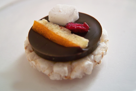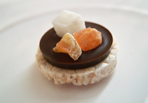 思ったとおり、このシリーズでは理想の組み合わせです。オレンジピールの柑橘系特有の苦さがココナッツの清涼感と合わさって山椒のよう。チョコレートの濃さは蒲焼のタレに通じるものがあるので、ポン菓子のお米の香ばしさによく合います。この寿司チョコレートの中ではココナッツとオレンジピールの組み合わせがベストね。