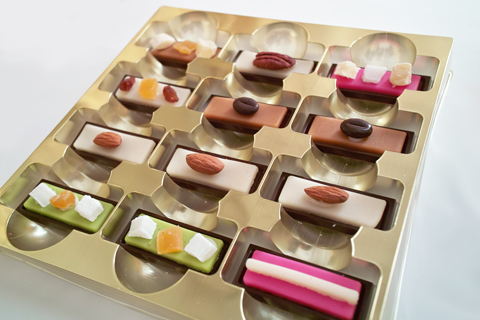 個々のチョコレートをつまみやすいように工夫された内装にも感心します。輸送にも耐えられるように、しっかりホールドされて、これなら少々の衝撃にも耐えられそう。ケータリングサービスなんかで使われそうだから、作る側もこの辺りには気を配っているんですね。