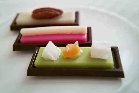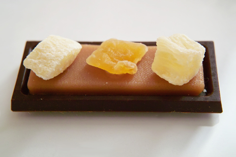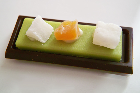 トッピングはドライフルーツです。白いのはココナッツ、真ん中の黄色はマンゴーですね。緑のマジパンからは杏仁の香りがします。トッピングとマジパンのいろんな味をチョコレートのしっかりした苦味がまとめています。