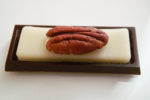 ベルギーチョコレートに白いマジパン、そしてペカンナッツ(ピーカンナッツ)が乗っています。チョコレートは苦味がしっかり効いたもので、ナッツ感が高いもの。甘味が抑えられてすっきりとした味になっています。口溶けも滑らか。このチョコレートではペカンナッツが主張しているのはもちろんですが、チョコレートの味と共にマジパンの食感がなんだか面白い。ナッツがもうすこしカリッとしているといいね。