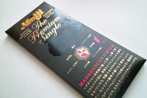 ザ・プレミアムシングルシリーズは、今年1月にバレンタイン商戦用に発売されたコンビニチョコレートです。コンビニで400円という破格のお値段が期待感をそそり、手を伸ばしては引っ込めるという動作を繰り返していました。業務用のクーベルチュールを扱う明治製菓は時々驚くようなコンビニチョコレートを出すので、このチョコレートも発売当時から気になる存在でした。今回、スーパーでお買い得だったのでようやく手に取ったという次第です。