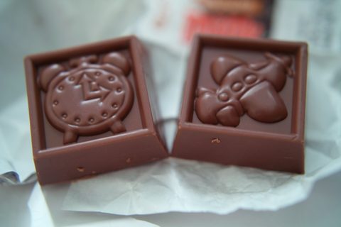 銀紙を開けると、昔はなかった模様が入っていました。何種類かあるんでしょうね。今回の2個は飛行機と目覚まし時計の模様が描かれています。ミルクチョコレートの中には生クリーム入りのミルククリームが入っています。