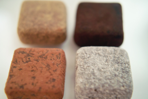 トゥルファスコレクションはトリュフのシリーズ。左上から時計回りに、カラメロ、ブランカ、グランマルニエ、テキーラの4種類です。