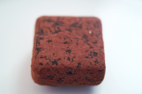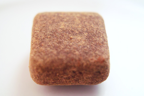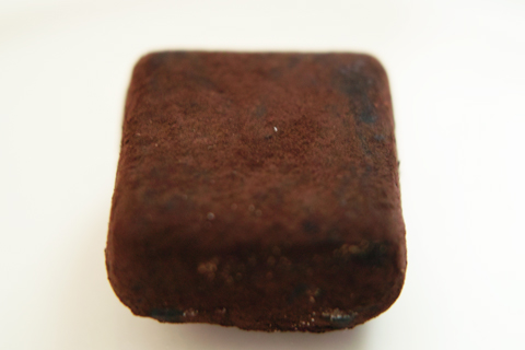 指でつまむと、意外にしっかりした感触。四角いフォルムからフランス系のトリュフを想像していましたが、表面のコーティングは思ったよりも厚みがあります。