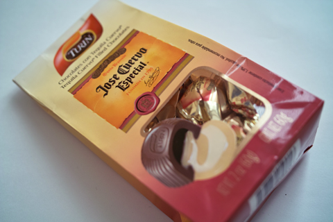 昨日のカルーアリキュール入りチョコレートに引き続き、メキシコの大手チョコレートメーカー、チューリン(Chocolates Turin)のテキーラ入りチョコレート(Chocolates con Tequila Cuervo; Tequila Cuervo Filled Chocolates)です。