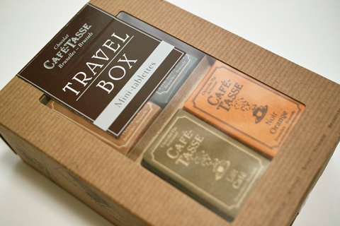 今日のチョコレートは、海外からのお土産のおすそ分け、カフェタッセ(Café-Tasse)のトラベルボックス ミニタブレットです。