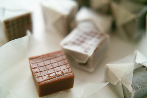 中には18粒のパラフィン紙に包まれたキャラメルが入っています。網目の模様が入ったキャラメルは、チョコレート色で濃い茶色です。