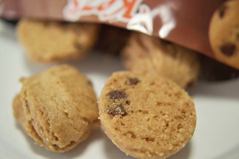 直径3センチの小さなクッキーが5個入っています。「バター風味豊かな生地にチョコレートチップが入った一口サイズクッキー」です。